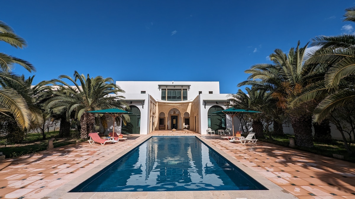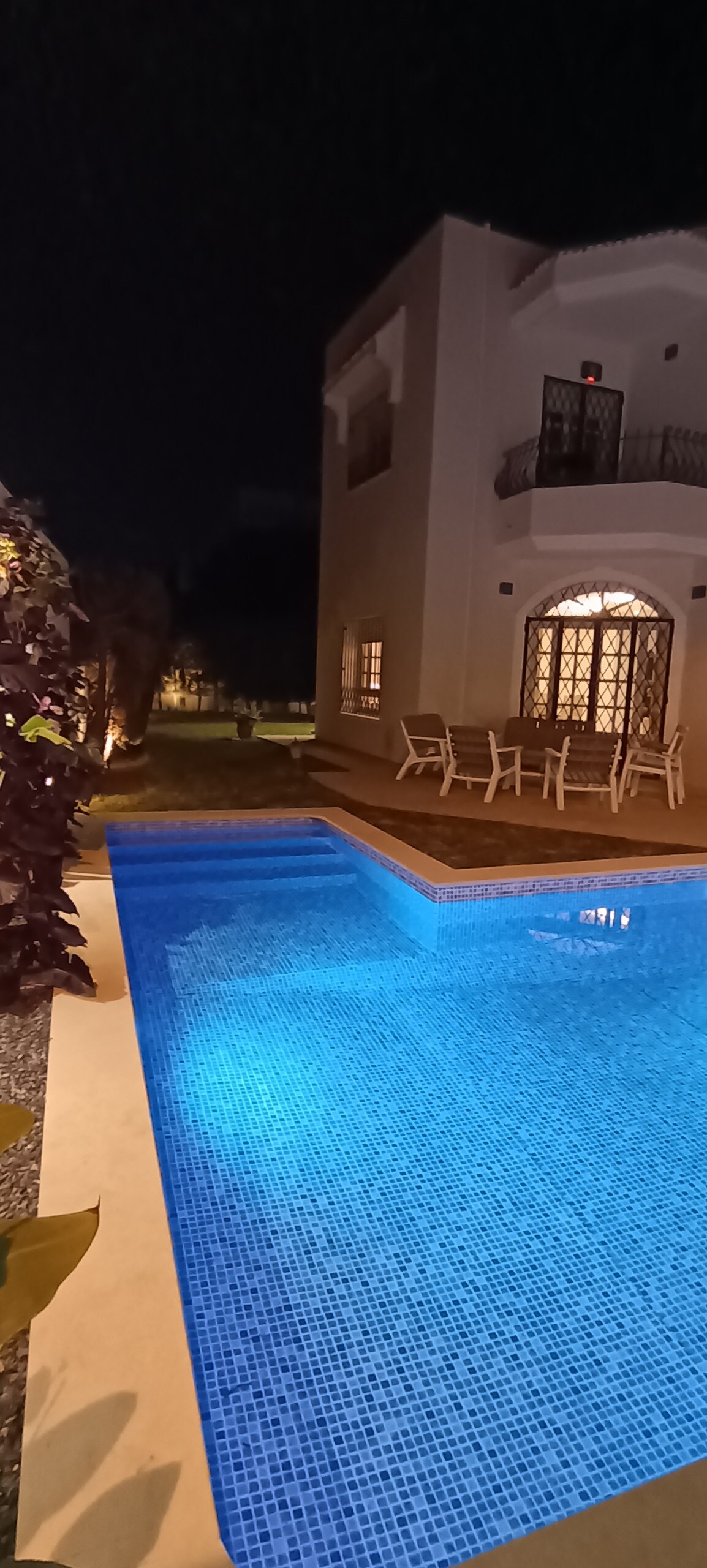 Vaste Villa S5 décorée dans un style tunisien chic mêlant charme local et authenticité. Parfaite pour se détendre dans un cadre élégant et apaisant, très proche des plus belles destinations de la banlieue nord de Tunis. •Grand jardin avec table de ping pong •Grande piscine privée sans vis à vis ensoleillée •Wifi, climatisation, cheminée et cuisine entièrement équipée •Située dans un quartier calme et sécurisé •À 12–19 min de Carthage, Sidi Bou Saïd et La Marsa •Parking dispo
