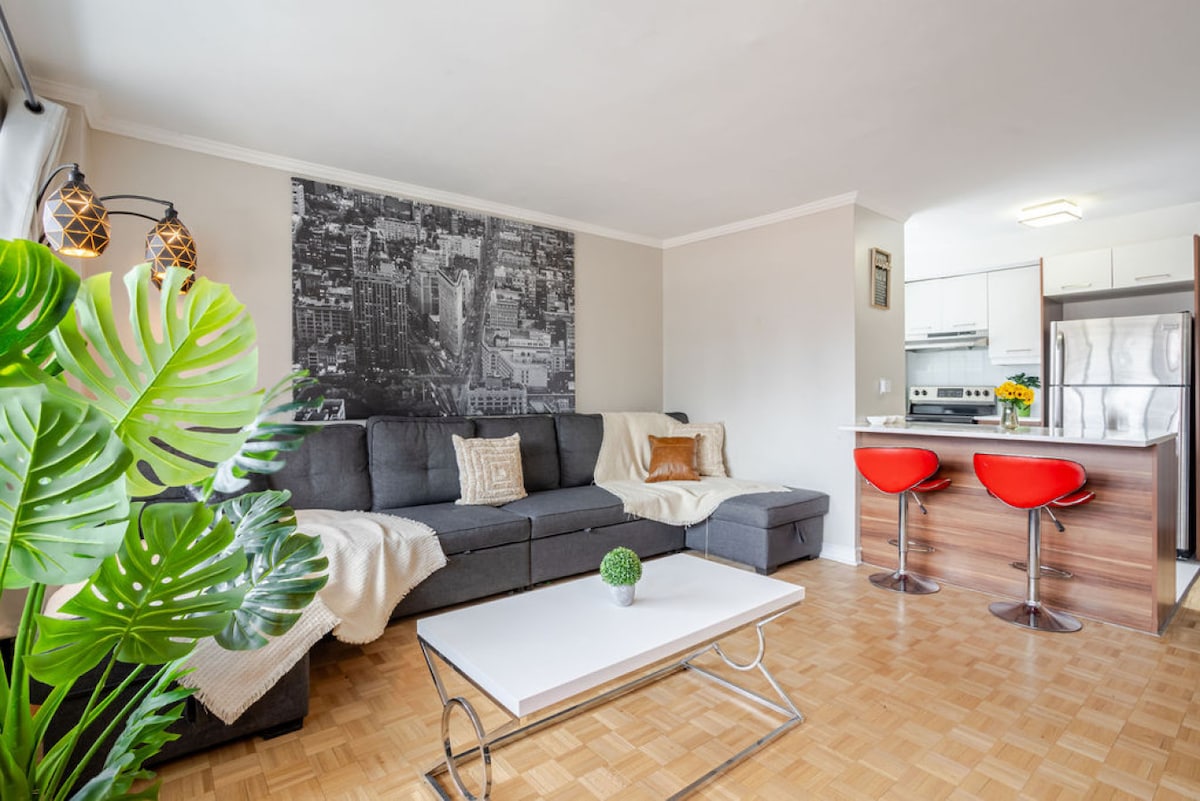 A belváros szívében található, közvetlen hozzáféréssel a Bell Centerhez! Élvezd a luxust és a kényelmet egy teljesen berendezett, egy hálószobás lakással, amely ingyenes kávét, kenyérpirítót, vízforralót és minden konyhai eszközt tartalmaz. Szauna, medence, edzőterem számos súlyzóval és géppel, skylounge, játékterem, társalgó és terasz több grillezővel, amelyek mindegyike a rendelkezésedre áll! Élvezd az ingyenes mélygarázst és az 1 perces hozzáférést a metróhálózathoz anélkül, hogy ki kellene lépned a szabadba! A Netflixet is beleértve