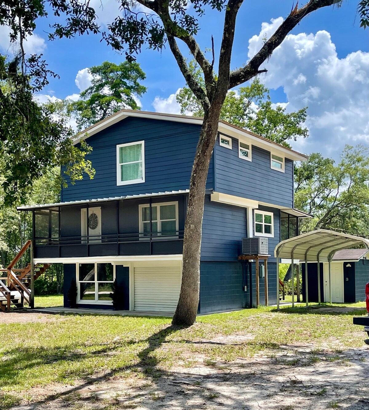 Ez a háziállatbarát, három hálószobás, három fürdőszobás szálláshely Branfordban (Florida) található, a Hatch Bendben található festői Suwannee-folyó partján, és tökéletes a hétvégékre vagy hosszabb tartózkodásra. Az emeleten két king méretű hálószoba található saját fürdőszobával, egy hangulatos nappali gázkandallóval és egy teljesen felszerelt, modern konyha. A földszinten king méretű hálószoba, teljes fürdőszoba, teakonyha és élettér található. A zárt lift megkönnyíti a felszerelés szállítását. Tapasztald meg a kényelmet, a bájt és a Suwannee-folyó szépségét az elvonulásunkon!