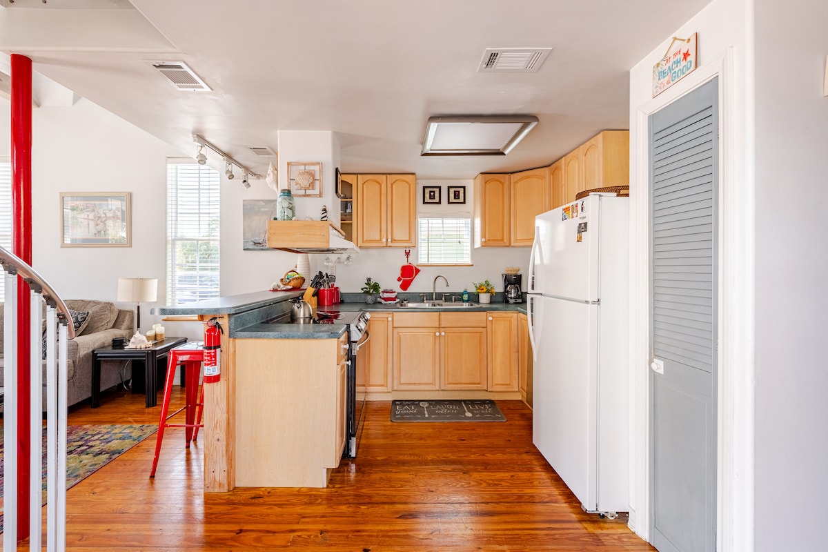 Gyönyörű tengerparti ház. Tökéletes pároknak vagy kis családnak. Mindössze 450 lábnyi sétára a strandtól! Ez egy 2 perces séta! A teljes emelet a fő lakosztály, saját fürdőszobával és gyönyörű zuhanyzóval. Kényelmes king méretű ággyal. A földszinti nappaliban van egy queen méretű Murphy ágy (a kanapé nem a legkényelmesebb, de én az ágyat választottam a kényelmes kanapé helyett), egy fél fürdőszoba, teljes konyha/étkező minden szükséges eszközzel a napi étkezésekhez. Kis elkerített udvar gyepes résszel háziállatok számára. Okostévé, Wi-Fi és mosókonyha.