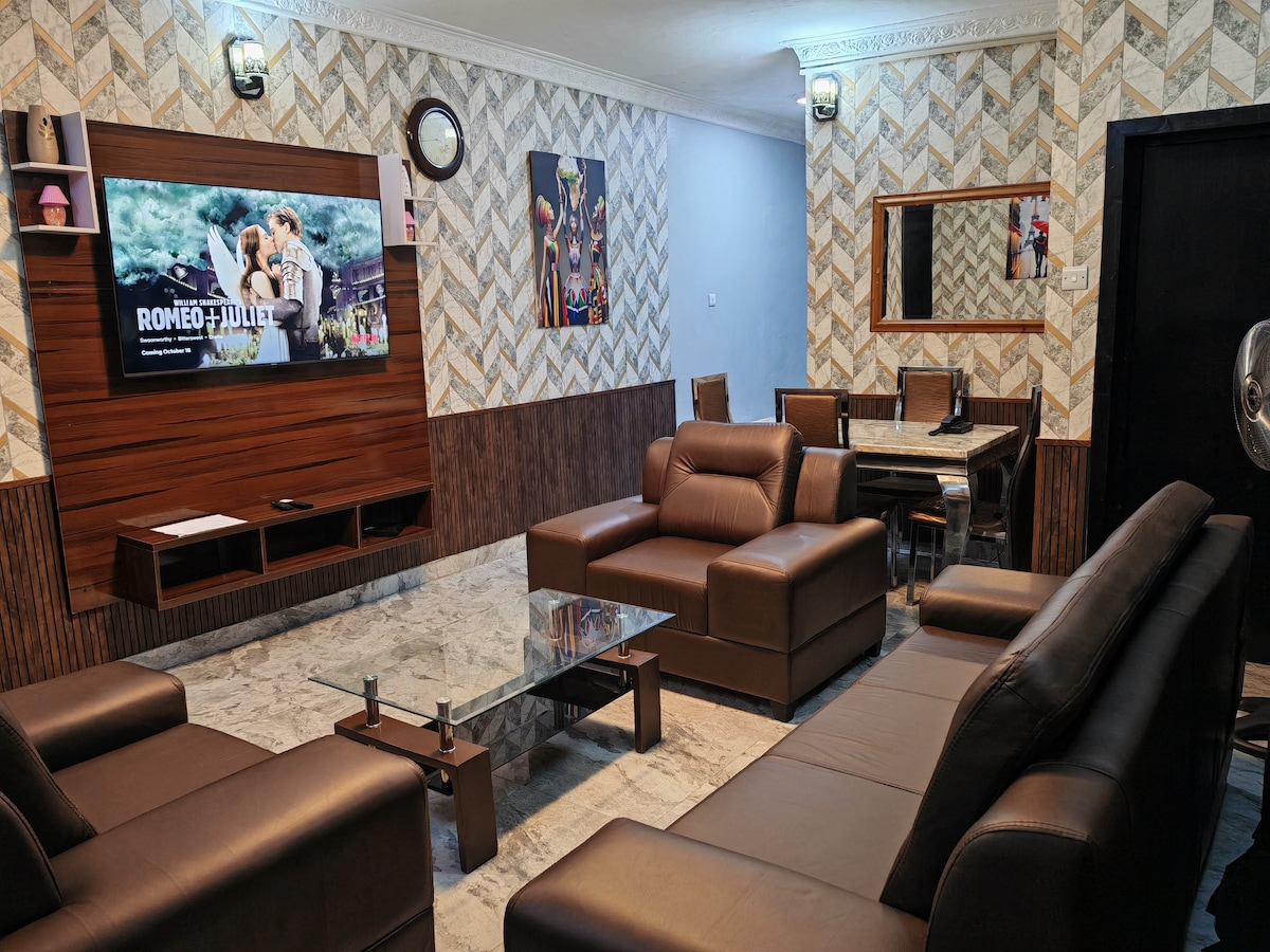 Standard fürdőszobás szoba félig ortopédiai szuperkirály méretű kényelmes matraccal, modern fürdőszoba vízmelegítővel. Korlátlan gyors WI-FI, 43 hüvelykes Smart Tv a hálószobában és 55 hüvelykes Smart Tv a nappaliban, Netflix, YouTube, DSTV, füstérzékelő, éjjel-nappali áramellátás a zenekarral A hálózat egyedülállóvá teszi a helyemet áramkimaradás nélkül, Cctv, maximális biztonság, 10 perc a nemzetközi repülőtérig és 5 perc a belföldi repülőtérig. Ragyogóan tiszta, tágas és jól szervezett lakás a kényelmed érdekében