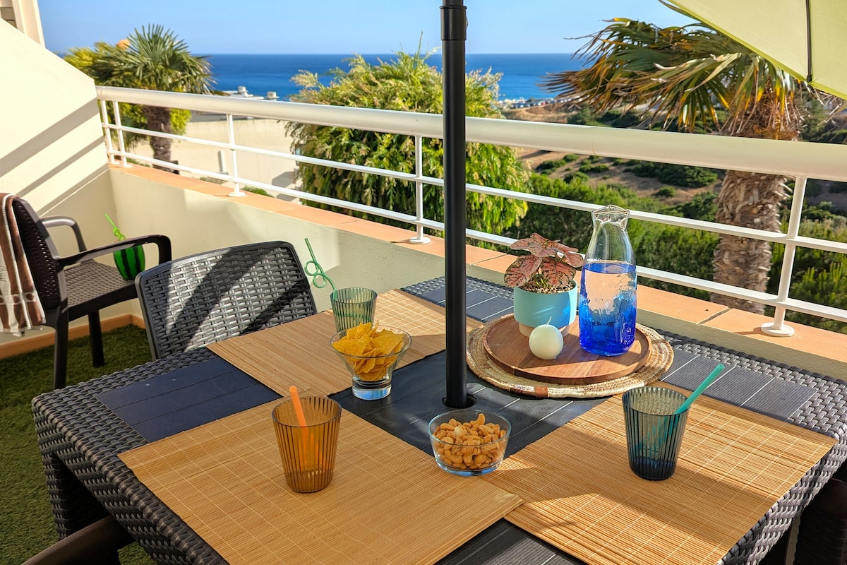 Beautiful spacious, comfortable apartment of 75m2 with air conditioning and fantastic views of the Atlantic Ocean and the mountains. Terrace both front and side. The fully equipped kitchen is equipped with a large refrigerator, dishwasher, washing machine, 4 burner induction hob, oven, coffee maker etc. A very spacious bedroom with a double bed. The modern bathroom has a walk-in shower, sink, toilet and underfloor heating for the winter. There is a closed parking lot.