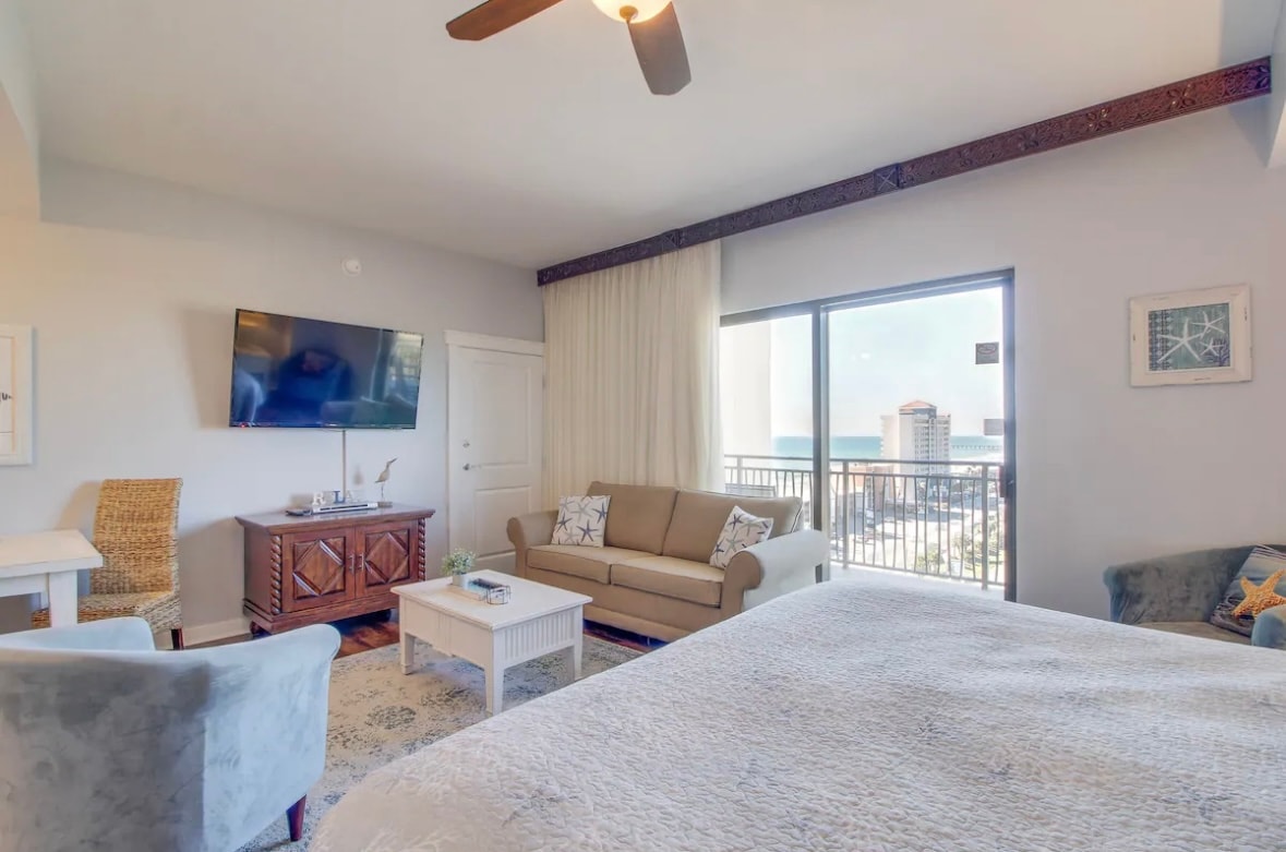 A 9. emeleten, az 1-es toronyban található stúdiónkból lélegzetelállító, páratlan panoráma nyílik a Mexikói-öbölre. Ez az óceánparti társasházi lakás szabványos bútorokkal és bőséges hellyel rendelkezik, így tökéletes lehetőség egy romantikus kiruccanáshoz NYÁK egyik legnépszerűbb üdülőhelyén: a Majestic Beach Resortban. Ez a hely olyan lesz, mint egy szálloda mindössze pár méterre a strandtól. Március 1. és október 31. között strandszolgáltatást is biztosítunk (2 strandbár és 1 esernyő), amelynek értéke napi 60 $.