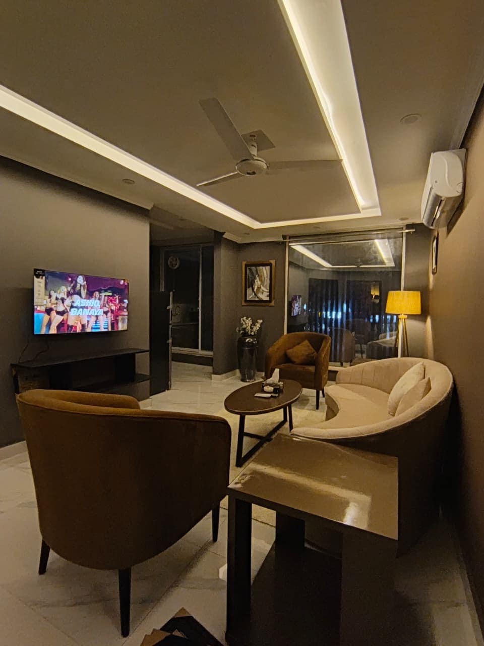 Our 1 BHK Orbit Penthouse in DHA Phase 5 is where urban chic meets celestial cool. Think: a glowing moon wall for those late-night selfies and a bold dollar-stacked art piece that screams "main character energy" Wake up to park views from your private balcony swing, binge your faves on the 50" 4K Smart TV, or cook up something aesthetic in the fully loaded designer kitchen. The interiors? Abstract, stylish, and made for the feed. Plus, you're right next to Lahore's hottest dining spots.