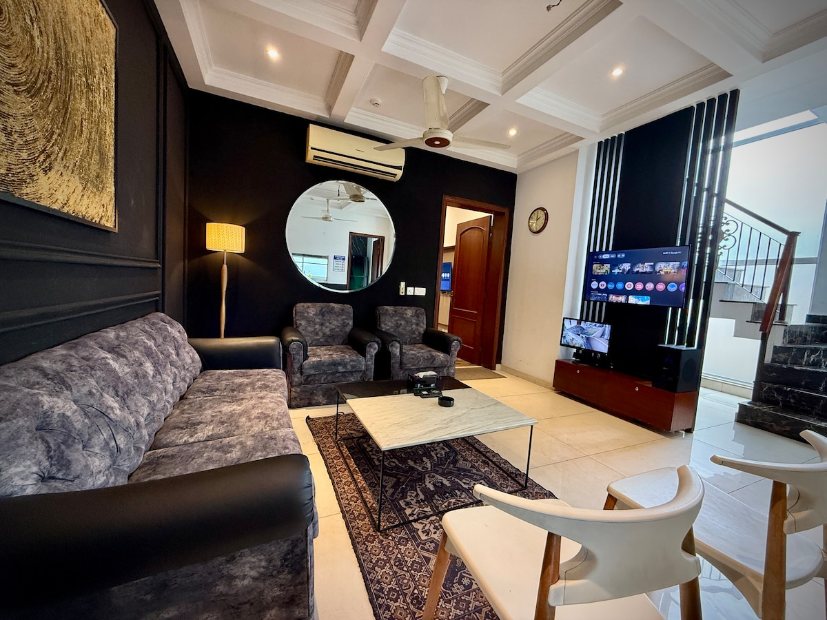 Élvezd a szálláshelyet ebben a stílusos, 3 hálószobás otthonban a DHA Phase 9 Townban, Lahoréban. Közel a DHA 5. és 6. fázishoz, a Dolmen Mallhoz és a Raya Markethez. Maradj hűvösen a légkondicionálóval minden szobában, pihenj a tágas társalgóban egy 55 hüvelykes Google TV-vel, és főzz egy teljesen felszerelt konyhában. A gyors Wi-Fi és a modern kényelem miatt tökéletes családok, csoportok vagy üzleti utazók számára. Könnyen megközelíthető bevásárlóközpontok, éttermek és a közeli legnépszerűbb látnivalók.