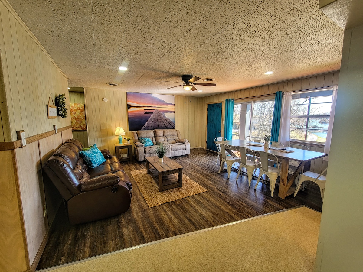 This place has got it all. From the amazing lake front views & access, a private dock, space for several families to sleep and seating to dine. Did we mention we have an extra slip at our dock for your boat? We have an amazing deck, water toys, plenty of board games, and a fire pit. Our home is directly across the bay from the beautiful Lake Barkley Resort where you can put in 18 holes of golf, take the kids horseback riding, or relax with a few cocktail in the restaurant or bar.