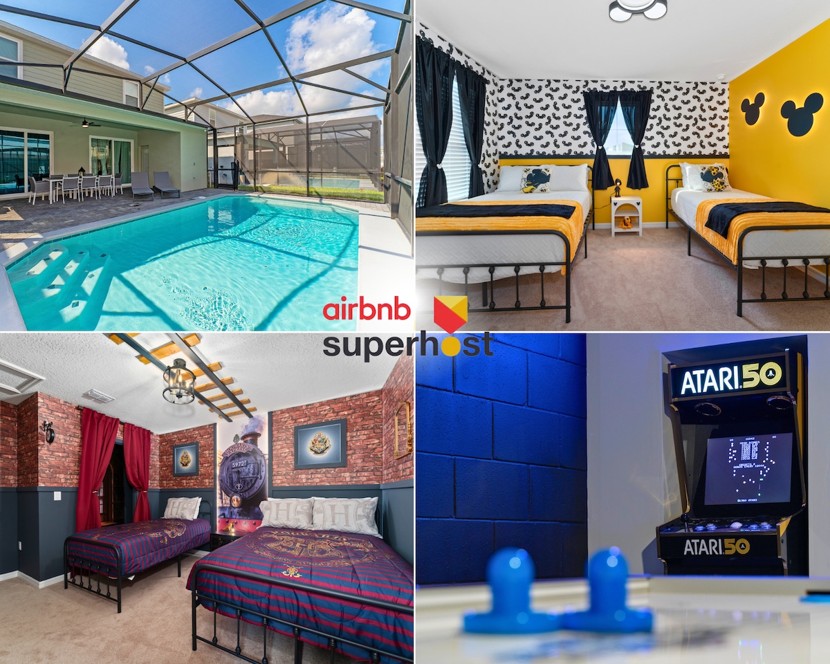 Professzionálisan megtervezett egy felejthetetlenül SZÓRAKOZTATÓ és ZÖKKENŐMENTES nyaraláshoz! ☆ HELYSZÍNI VÍZIPARK ☆ Tematikus JÁTÉKSZOBA ARCADE játékgépekkel és prémium játékteremmel ☆ Rendkívül kényelmes ágyak. Legfeljebb 12 vendég fér el ☆ Egyedi témájú Moana-hálószoba ☆ 2 Luxury King lakosztály + 1 Queen lakosztály ☆ Luxus ágynemű ☆ Privát fűtött MEDENCE ☆ Teljesen felszerelt KÁVÉBÁR ☆ Teljesen felszerelt konyha edényekkel, étkészlet extrákkal ☆ Pattogatott kukoricakészítő ☆ Percekre a Disney Worldtől és a Universal Studios-tól. ☆ Családbarát
