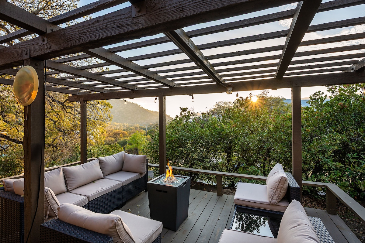 Mágikus kilátás a mamutfenyőkre • Hangulatos tűz + modern dizájn