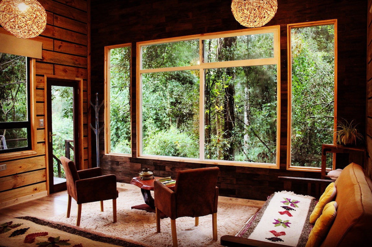 Cabaña matrimonial con una couchette adicional. Full equipada con baño, cocina, comedor. Aislada e independiente. Con wifi, tv cable, smart Tv, horno eléctrico.En medio de un jardín y árboles nativos que invitan a la recreación y al descanso. Servicios de spa opcionales: Jacuzzi, sauna y masajes. Se requiere reserva previa. No incluye desayuno