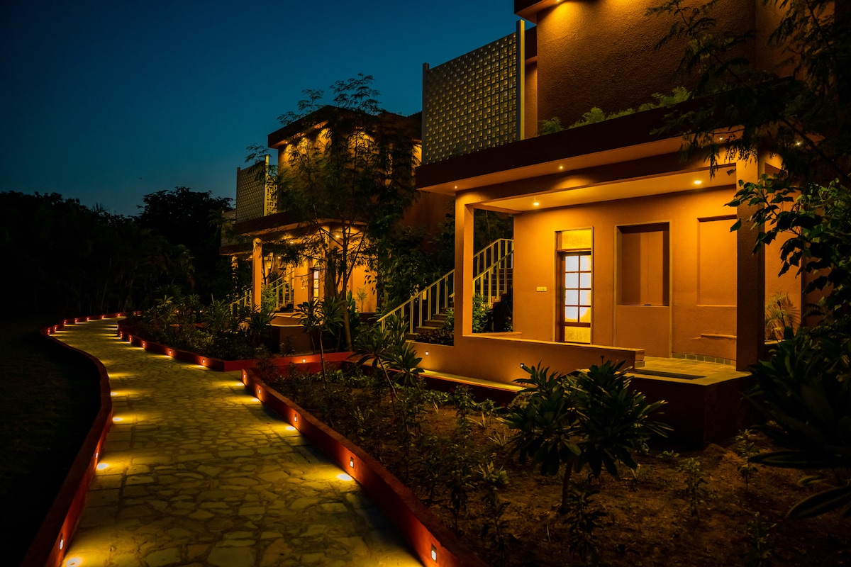 Set amidst calm, green surroundings, this 1BHK, convertible into a 2BHK, features a spacious living room with a sofa-cum-bed. The bedroom opens to a private plunge pool within an inner courtyard with loungers & warm lighting whereas bathroom with jacuzzi , private garden & balcony add comfort. Landscaped common gardens, game zone, restaurant, coffee house, open-air courtyard, outdoor pool, gym & riverside seating complete a well-appointed stay near Udaipur’s key attractions nearby city.
