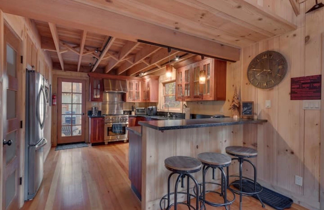 The Chalet 300 l Tahoe West Shore Cabin This adorable, authentic pine cabin has all the luxuries of tiny home living, and just a short walk to Sunnyside and Lake Tahoe. Nestled in the pines, it exudes the ultimate in a mountain lifestyle visit. Completely renovated, this one bedroom, 1 bath has all new appliances in the renovated kitchen, all new bath, eclectic living space, and inviting bedroom. Large windows look out towards the pines and the spacious wrap around deck. Lake Tahoe so close.
