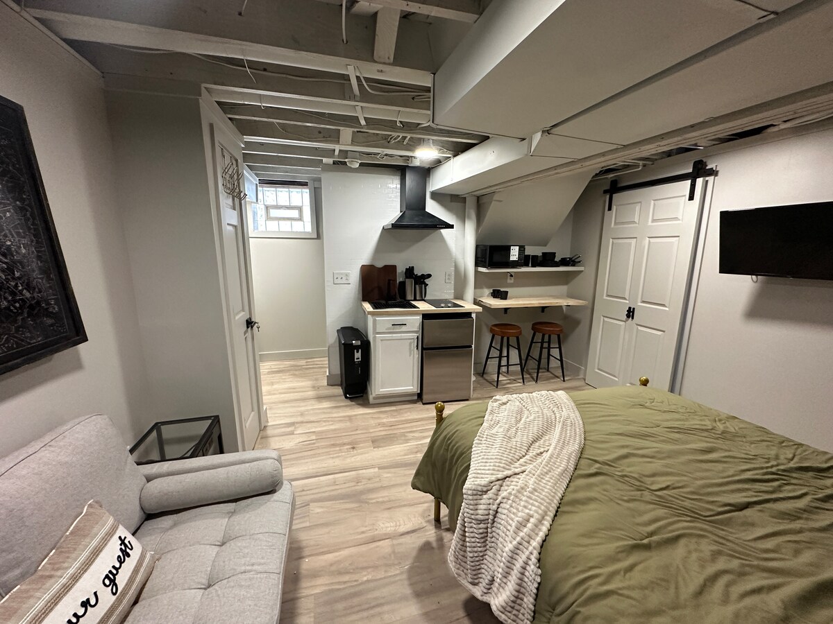 A 2021-ben felújított otthon egyedi ipari stílusa hozzájárul a modern megjelenéséhez. Az otthon 3 hálószobával rendelkezik, amelyekben king, queen méretű és teljes méretű ágyak találhatók. Az alagsorban van egy futonágy és egy kanapé a nappaliban, amely két további ember elszállásolására alkalmas. Az otthon tágas, két helyet kínál az embereknek a pihenéshez, az egyik az első emeleten, a másik pedig az alagsorban. Az alagsorban van tévé, „bár” és egy munkaállomás.