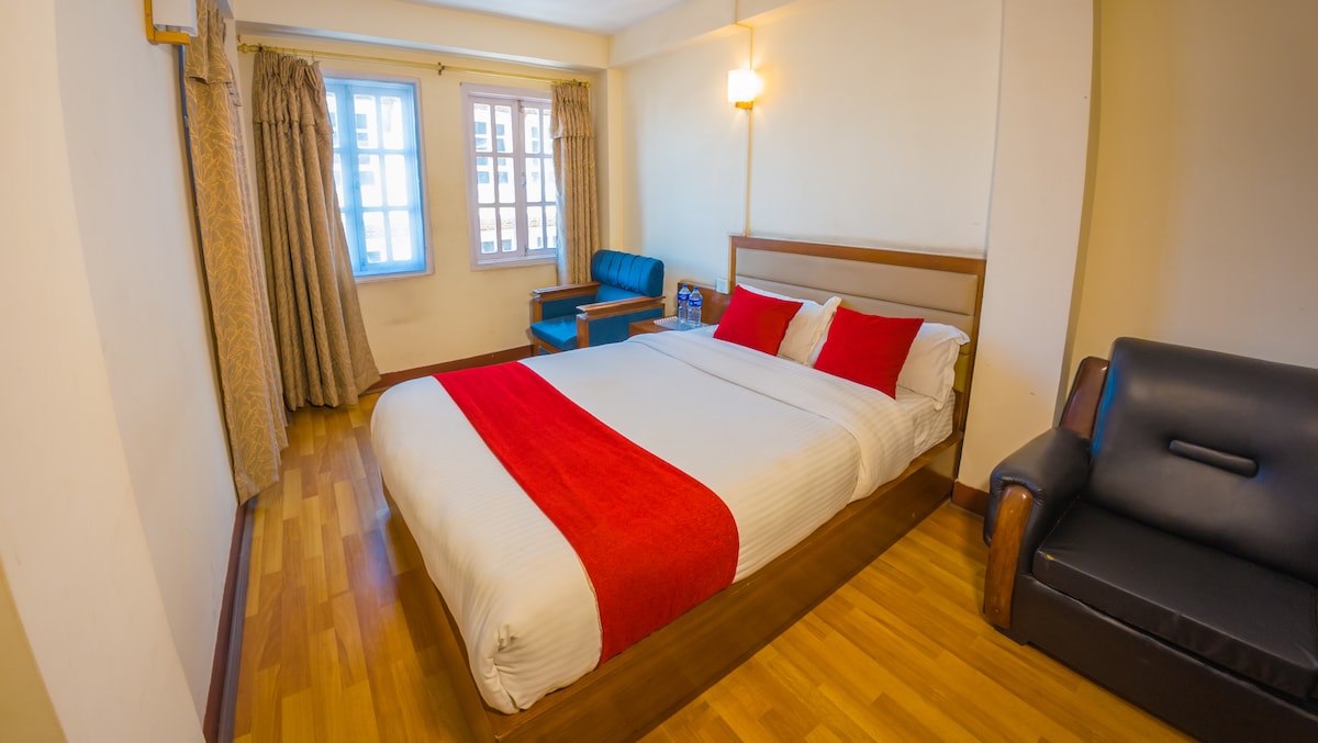 Spacious traditional room at Kathmandu Valley offering restful luxury with heritage flair. Relax in king-sized bedding, unwind on the sofa, and take in views over Patan. Includes mini-fridge, ensuite bathroom with premium toiletries, AC, and complimentary high-speed internet, ideal for couples wanting extra space in heritage hotel rooms at Nepal.