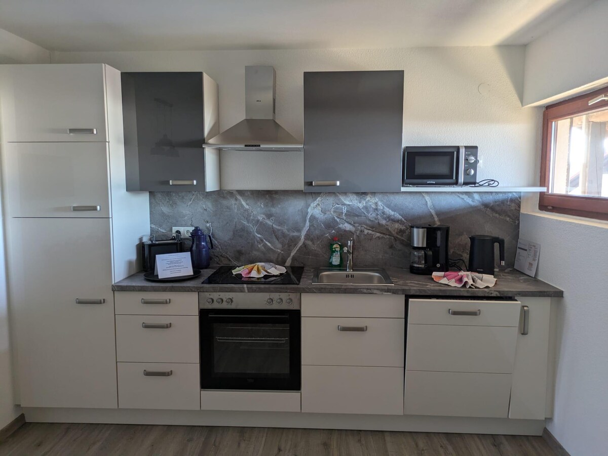 Moderne neu renovierte Ferienwohnung, 2 Schlafzimmer mit je einem Doppelbett und Terrasse, ein Badezimmer mit Dusche / WC und Fön, vollausgestattete Küche mit Geschirrspüler. Von der Wohnküche mit gemütlicher Sitzgruppe, Flachbild- TV, gehen Sie auf ihren großen Balkon, Süd- West- Seite mit Blick ins schöne Zellertal.