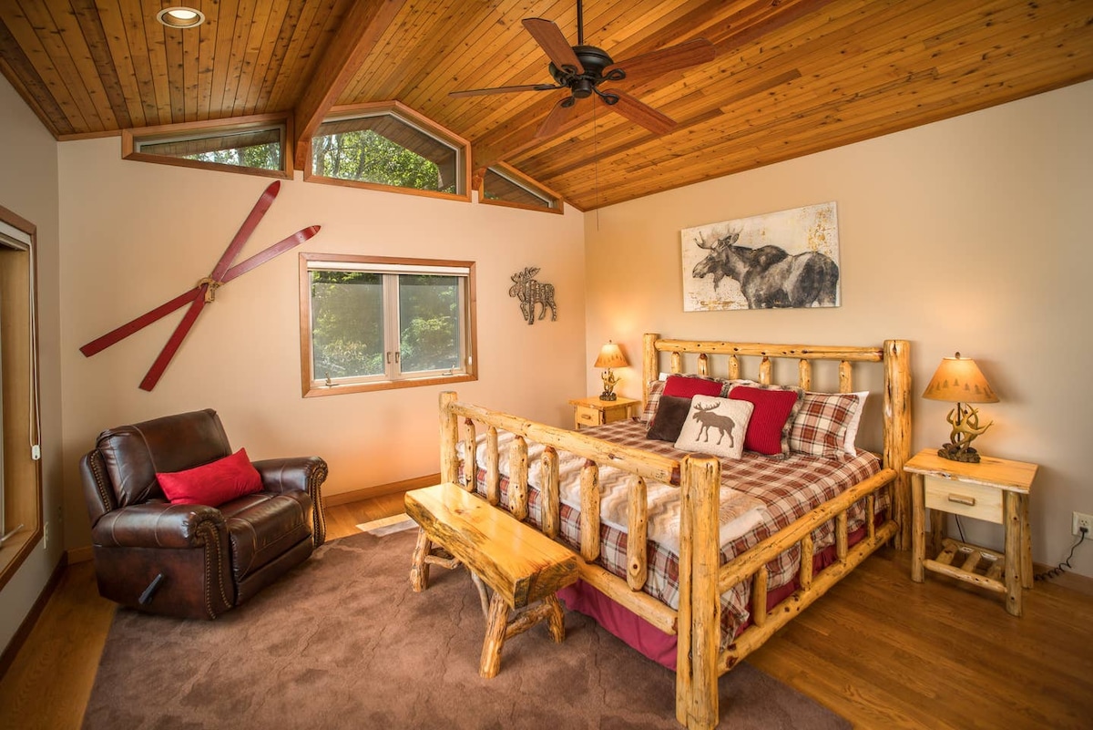 The A-Frame on Blueberry Hill can comfortably sleep 8 guests. You will love the huge deck & the large hot tub. The property sits on 5 acres made up of rolling hills & 2 small ponds. In addition to the king & queen bedrooms, there is an upstairs loft area with a queen bed adjacent to the bathroom, as well as a recently renovated full basement with a set of bunk beds, a queen bed, and a large sectional sofa and TV. This is a perfect spot for kids or teens!