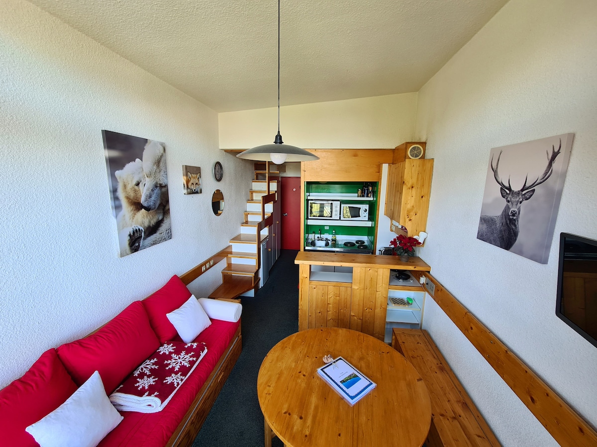 Studio de 25 m2 centre station. Accès pistes via ascenseur. A partir de l'hiver 2026/2027, vous aurez accès à un casier à skis. Bien équipé pour faire la cuisine. Coin chambre dans le couloir, au niveau de l'entrée : 1 lit double + 1 lit double en hauteur (mezzanine). Nous acceptons les courts séjours et des arrivées/départs n'importe quel jour de la semaine. Nous ne sommes pas sur place et donc chaque locataire doit réaliser avec soin le ménage du studio.