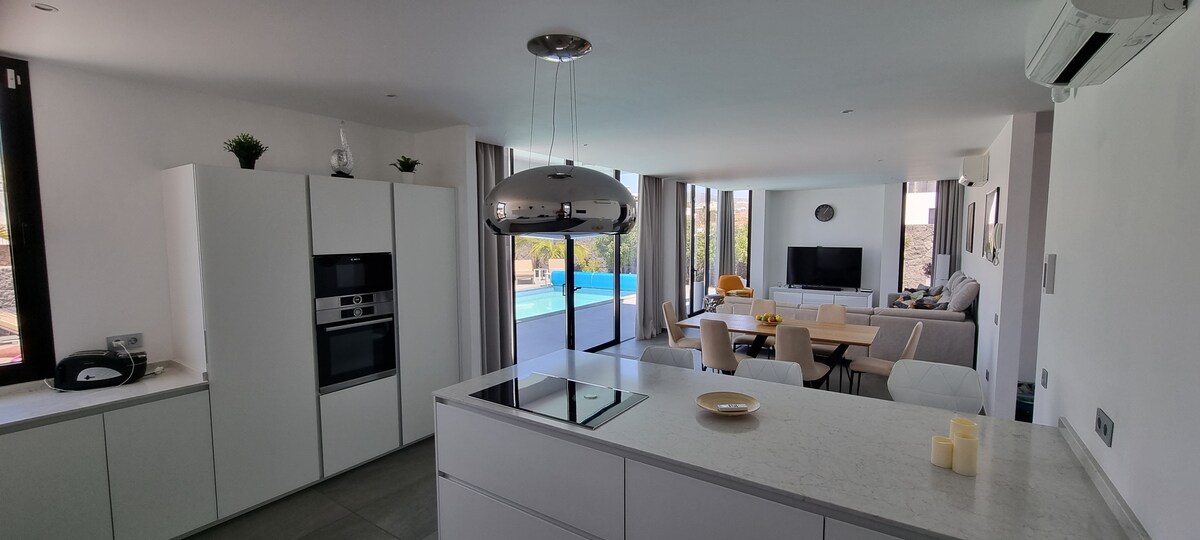 -Recently built, luxurious modern villa with 5 bedrooms all with en-suite bathrooms. Its built on a 2000m2 plot where there is a parking area right by the front door and a charging point for electric vehicles. -Incredible panoramic views of the sea, Fuerteventura and the volcanic mountain range of Los Ajaches. -Large terraces and gardens, heated 12.5M x 3m pool, jacuzzi, Gym, BBQ, fire pit, pool table and table tennis. -Fibre optic WIFI, 2 smart TVs including channels in most languages!