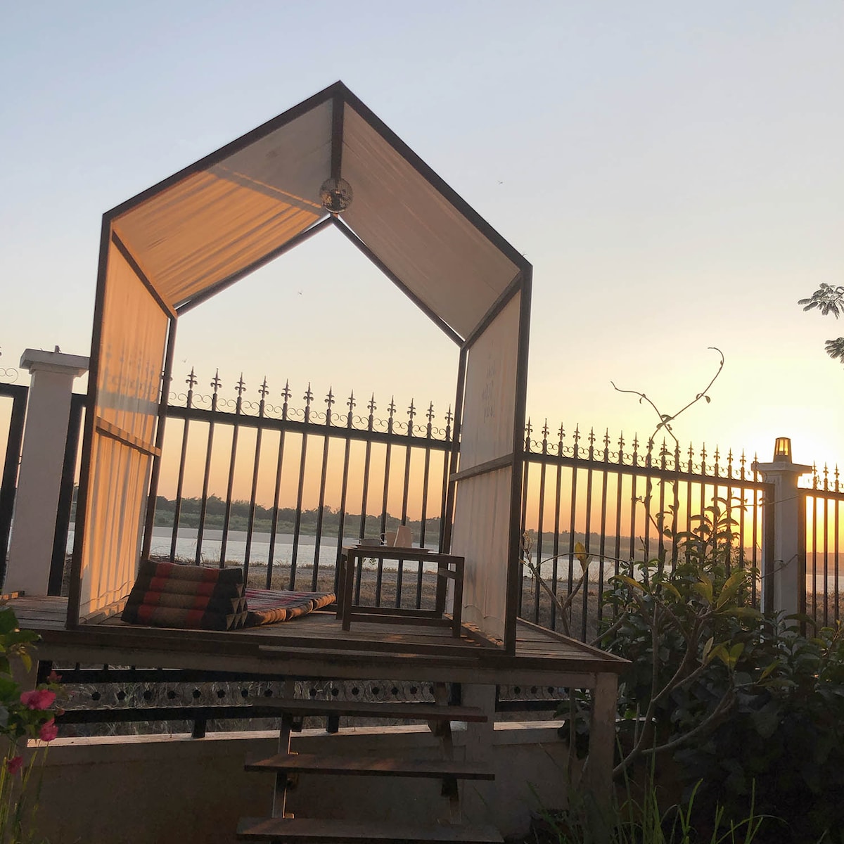 Located on the banks of the Mekong River, this spacious ground floor apartment in our French Colonial style home, provides a relaxed Laotian lifestyle with modern comforts. Step out of the fully air-conditioned, wifi-enabled, 2-bedroomed apartment to relax on a sofa on the tropical garden terrace, or discover the traditional Lao ways of life on a walk along the rural river bank (direct access from the terrace / garden), especially during the sunsets that will take your breathe away.