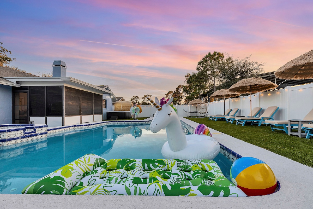 Üdvözlünk a Seminole Shores Villában, a 223 négyzetméteres trópusi gyógyfürdős oázisodban! Ez az ingatlan egy 4BR-es otthon rengeteg kényelmi szolgáltatással, hogy a szálláshelyen eltöltött időd igazán emlékezetes legyen. Bár a strandok közel vannak (<5 perc), lehet, hogy soha nem akarsz majd elmenni a fűtött, sós vizű medencétől, amely egy hatalmas, gyógyfürdőszerű hátsó udvarban található, és rengeteg magánéletet és programot kínál. Ezt a házat 2023-ban teljesen felújították, trópusi dizájnnal. Az élményprogramod részeként a tiszta és biztonságos környezetet részesítettük előnyben.
