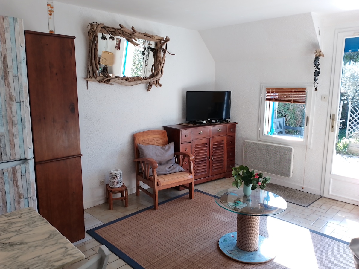 Appartement t2 de 43 m² indépendant d' une maison individuelle exposition Sud, 2 à 4 personnes. Au sein d' un magnifique village Breton de bord de mer, 5 minutes à pieds de la plage et du bourg. Situé au calme dans un écrin de verdure, jardin paysagé et clôturé d'un muret typique de pierres sèches.