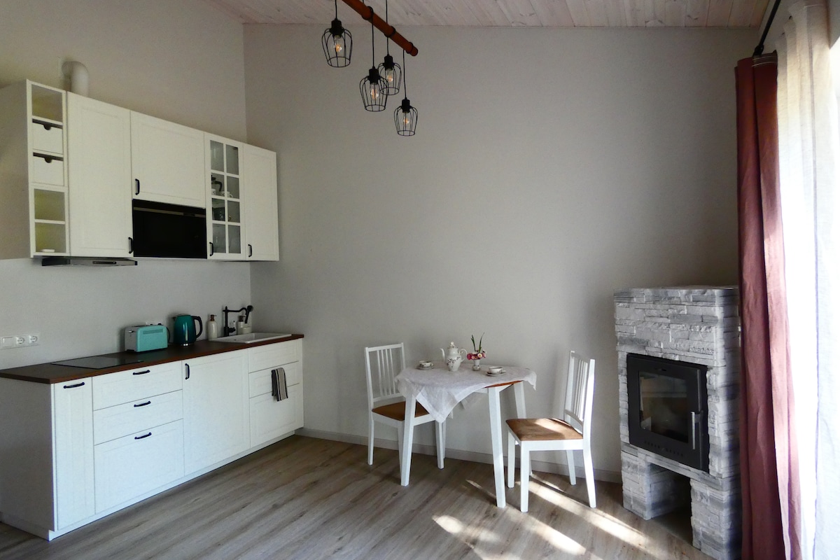 Rudenī šeit ir patīkami silti, un telpu temperatūra tiek uzturēta stabila. Te mājo laika pieskāriens ar koka durvīm, grīdām un logiem. Tieši tas piešķir vietai siltumu un stāstu. Ja jums patīk īstums un dzīva vide, jūs šeit jutīsieties labi. Šī ir vieta, kur jūties gaidīts un pieņemts. Dzīvoklis ar balkonu, dārzu un draudzīgiem sunīšiem pagalmā — piemērots mierīgai atpūtai pāriem, draugiem vai ģimenēm ar bērniem no 7 gadu vecuma. Ir iespēja iznomāt divriteņus 4gab.