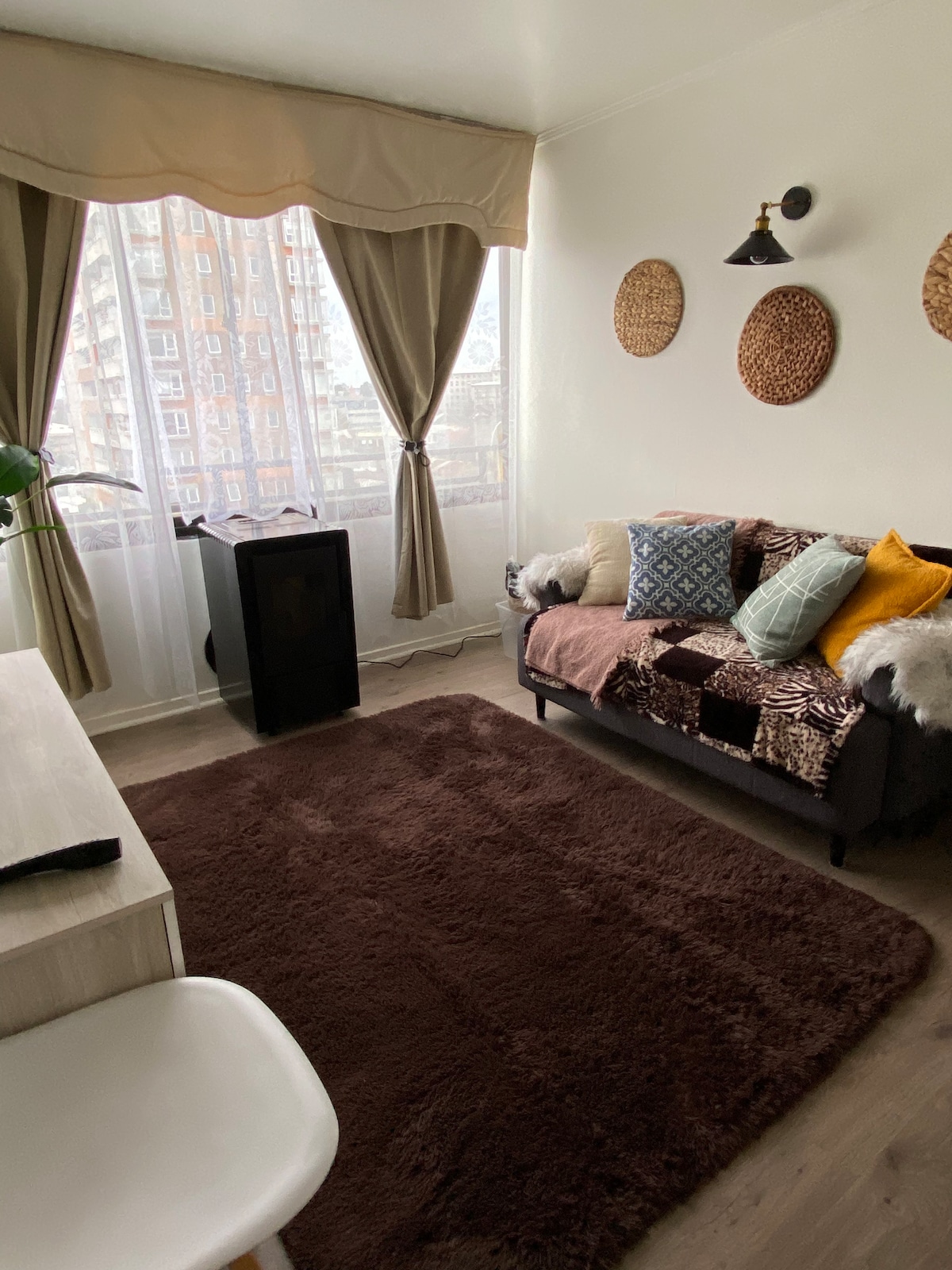 Teljes, hangulatos lakás 4 vendég számára franciaággyal, fészekággyal (tengerész) és futonnal. Temuco központjában található, pár lépésre a szupermarketektől, a devizáktól, a gyógyszertáraktól, a bankoktól, az éttermektől és általában a kereskedelemtől. Saját fedett parkolóval, légkondicionálóval, mosógéppel/szárítógéppel, az erkélyen található védőhálóval, edzőteremmel (szabadon álló díj ellenében), Wi-Fi-vel, TV-kábellel a hálószobában és a nappaliban található étkezővel rendelkezik. Nonstop ügyintéző és biztonsági kamerák.