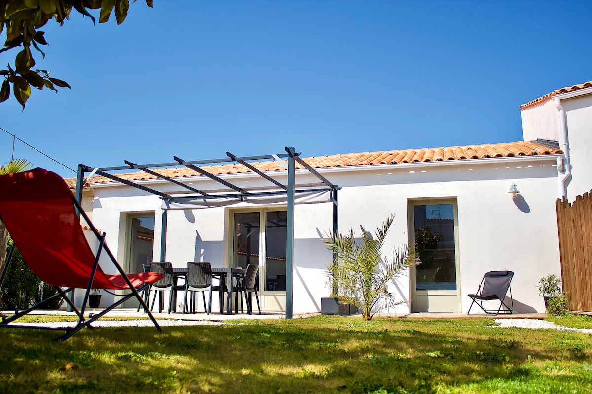 Ez a nagyon kényelmes, egy szinten található, nagyon kényelmes ház délre néz, kényelmes nappalival, felszerelt konyhával, 2 hálószobával, mindegyik fürdőszobával és zuhanykabinnal, 2 külön WC-vel. Egy nagy terasz, amely napsütésben fürdik, és árnyékos terasz a kikapcsolódáshoz, egy közös kert, amely a kicsik biztonsága érdekében van körülvéve. A sziget központjában található, ideális kiindulópont Oléron szigetének felfedezéséhez.
