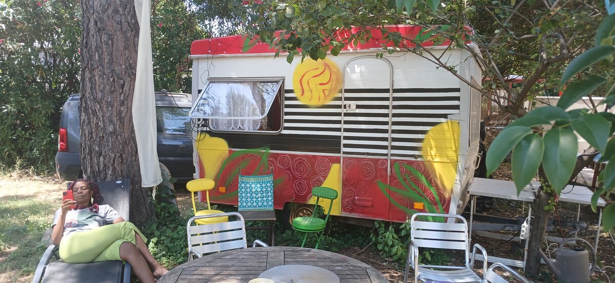 Gyere és lazíts a bohém lakókocsimban. A kert nagy , a szabadidődben élvezheted. A légkör nyugodt és frissítő . Ez egy olyan hely, amelyet békében osztanak meg az arra járó nyaralókkal. 20 percre vagy a tengertől és 20 percre Montpellier városközpontjától autóval . Wild setting by the pond of gold 5 minutes from the house ,walks , canoeing ...