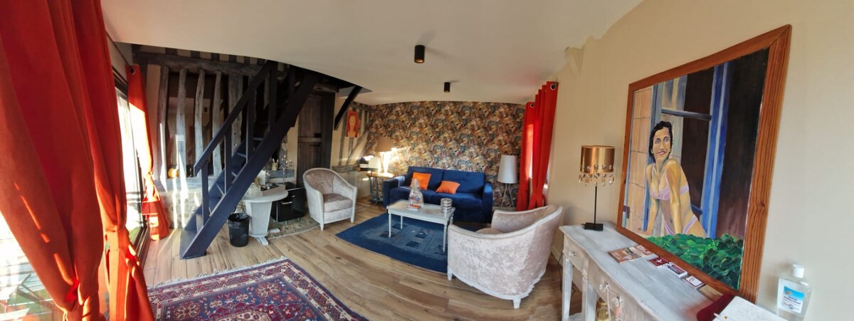 A Bassin d 'Honfleur-től mindössze 50 méterre található otthonos tetőtéri fészek nyitott fürdőkáddal tökéletes helyszínül szolgál egy romantikus kiruccanáshoz Honfleur város szívében. Közel a Pont de Normandie-hoz, a Szajna torkolatához, a Deauville-tányérokhoz, ez a lábad a szárazföldön lehetővé teszi, hogy ragyogj, és meglátogasd Normandia ékszereit.