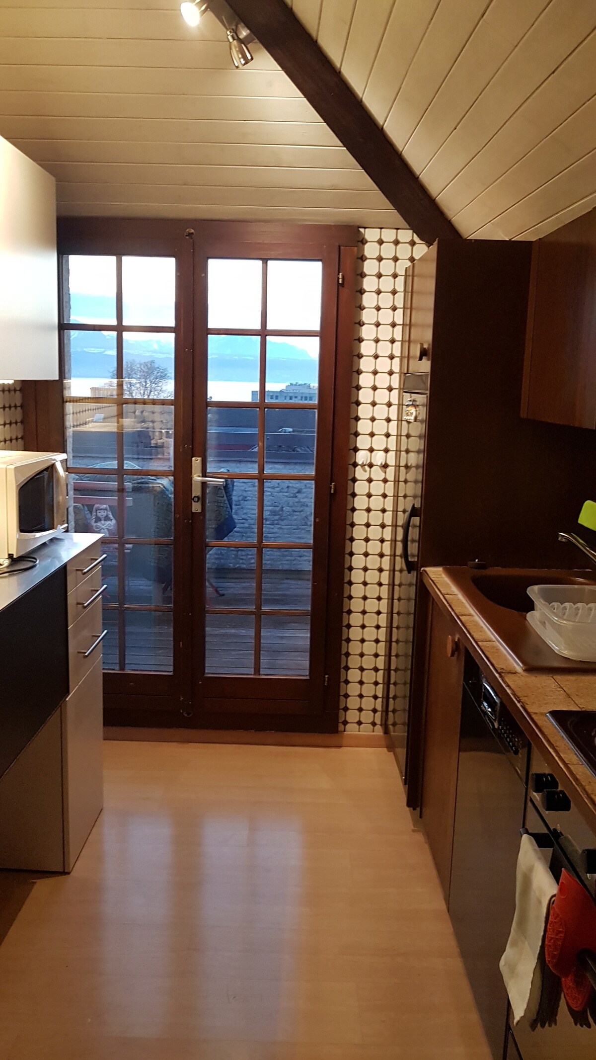 Kiváltságos hely, 180 fokos kilátással a szőlőültetvényekre, tóra és hegyre Új apartman, nagy terasszal, kilátással a tóra, Sok cachet, régi fa, természetes kövek, zuhanyzó, hajszárító, konyhasarok, mosogató, hűtőszekrény, vízforraló, tea, kávé, mikrohullámú sütő, sütő, 1 elektromos tűzhely, két edény, tányérok stb... Széf, LED TV, stb... Minibár, helyi borok! Ingyenes tömegközlekedés (vonat) Lausanne-ból Montreux-ba ! Ingyenes privát park a ház előtt!