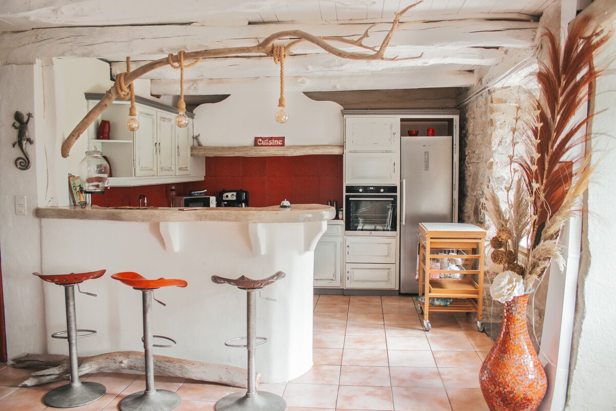A természet szívében üdvözlünk, amelyet egy atipikus szálláshelyekre felújított egykori juhászatban őriznek. Az emeleten egy 70 m2-es nagy nappali található, ahol egy nappali, egy felszerelt konyha és egy nappali található. Plusz egy vécé. A földszinten 3 hálószoba található, beleértve a lakosztályt, a fürdőszobát és a külön WC-t. Élvezheted a nagy, természetesen árnyékos teraszt, kerti társalgót,planchát, pétanque pályát.