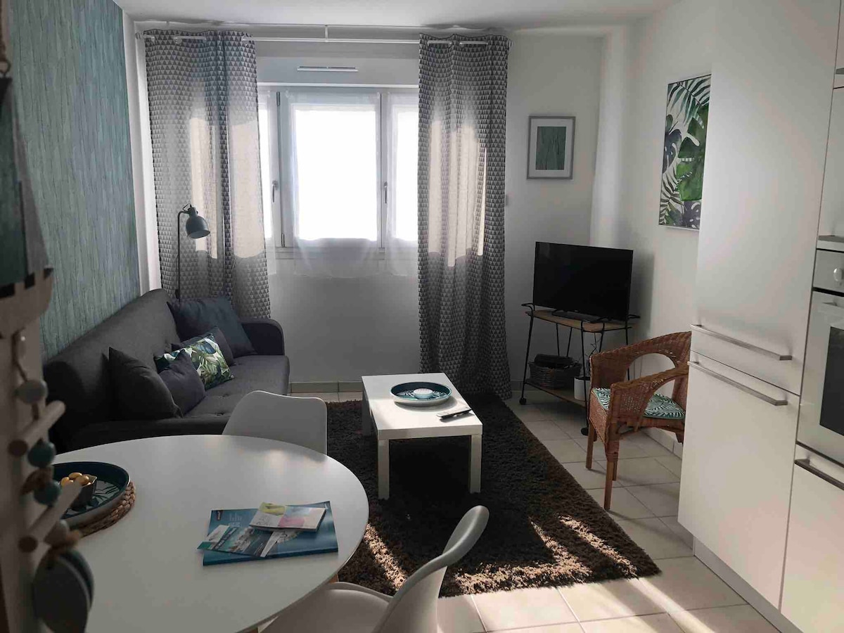 Hangulatos, meleg, 46 m2-es lakás bútorozott déli terasszal, a földszinten (32m2) egy közelmúltbeli és csendes lakásban. Télen jól fűtött. Ingyenes parkolás 5 perc sétára a vasútállomástól az üzletek közelében, 15 perc sétára a történelmi várostól és a strandoktól Ágynemű kérésre: 10 € ágyanként a foglalásért Ingyenes WC-törülközők A 2. vécé, amely független a fürdőszobától Ingyenes Wi-Fi Nbrx közeli éttermek főznek elvitelre. Tévézés lehetséges