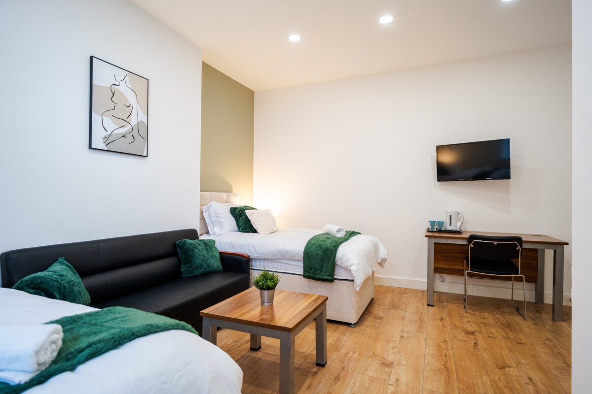 Olyan stúdiót foglalsz, amely egy kétszemélyes hálószoba saját fürdőszobával és zuhanykabinnal. A szobában van egy kis teakonyha, ahol mindent megtalálsz, amire szükséged lehet az alapvető főzési követelményekhez a szálláshelyen töltött időd során, valamint egy kis étkezőasztallal és székekkel. Ezek nem lakások, hanem stúdiók, és ideálisak üzleti vagy szabadidős tevékenységekhez. Önkiszolgáló helyiség, ahol minden ágyneműt, tisztítószert és felszerelést használhatsz a szálláshelyen. Ha szeretnéd, hogy kiszolgáljuk a szobádat, 30 £ összeget számítunk fel. Tájékoztass minket egy nappal az érkezés előtt.