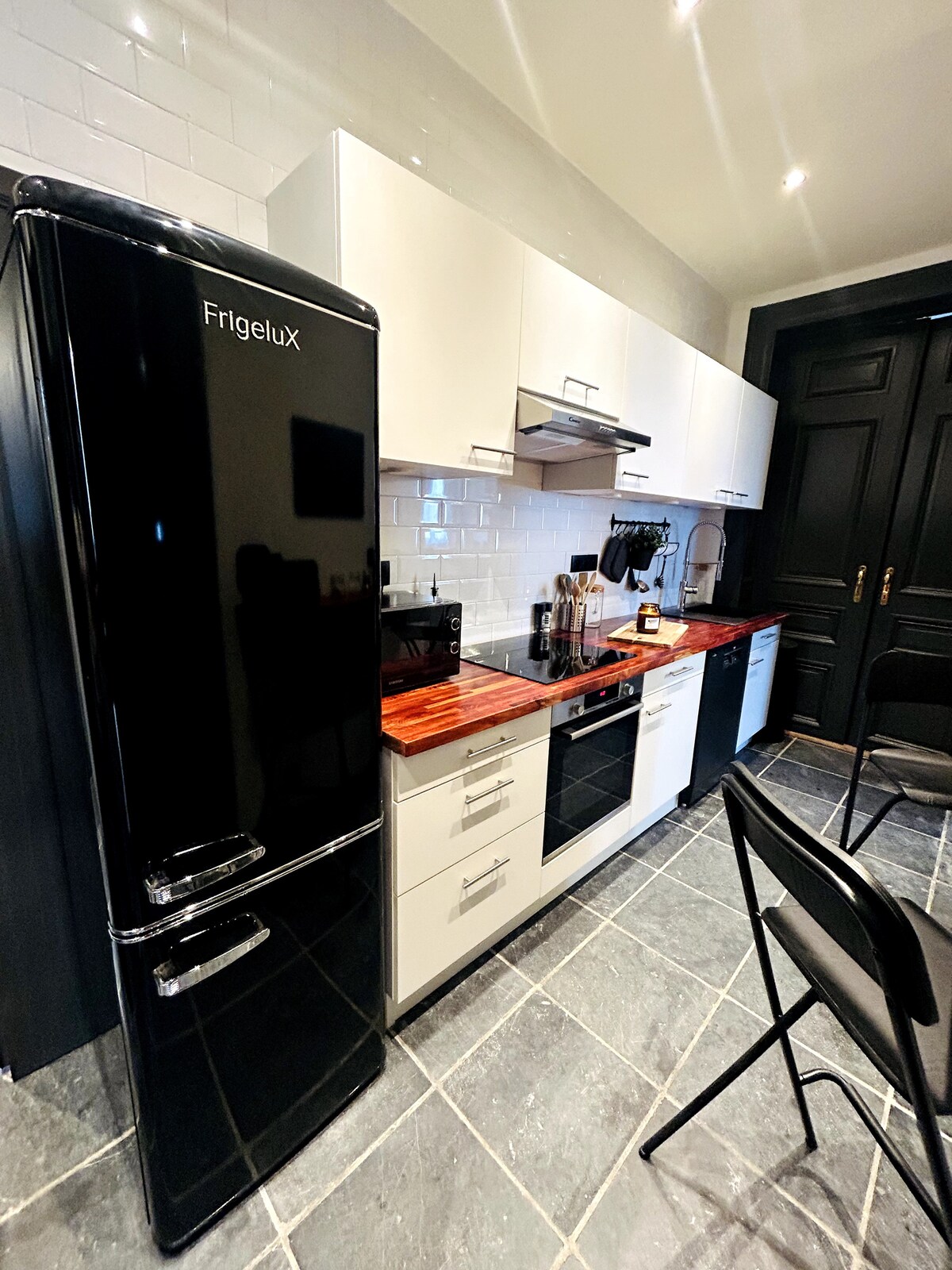 Quiet and bright apartment of 130 m2 recently renovated (2021) with high molded ceilings, on the 1st floor. Fully-equipped kitchen opening into a large dining room in continuity with a living room, an entry hall and a study. The duplex rear part of the apartment has 2 beautiful bedrooms, one with a BEKA bed, a bathroom with shower and bath, a separate toilet and a small equipped laundry room. Vintage furniture, warm and cozy atmosphere