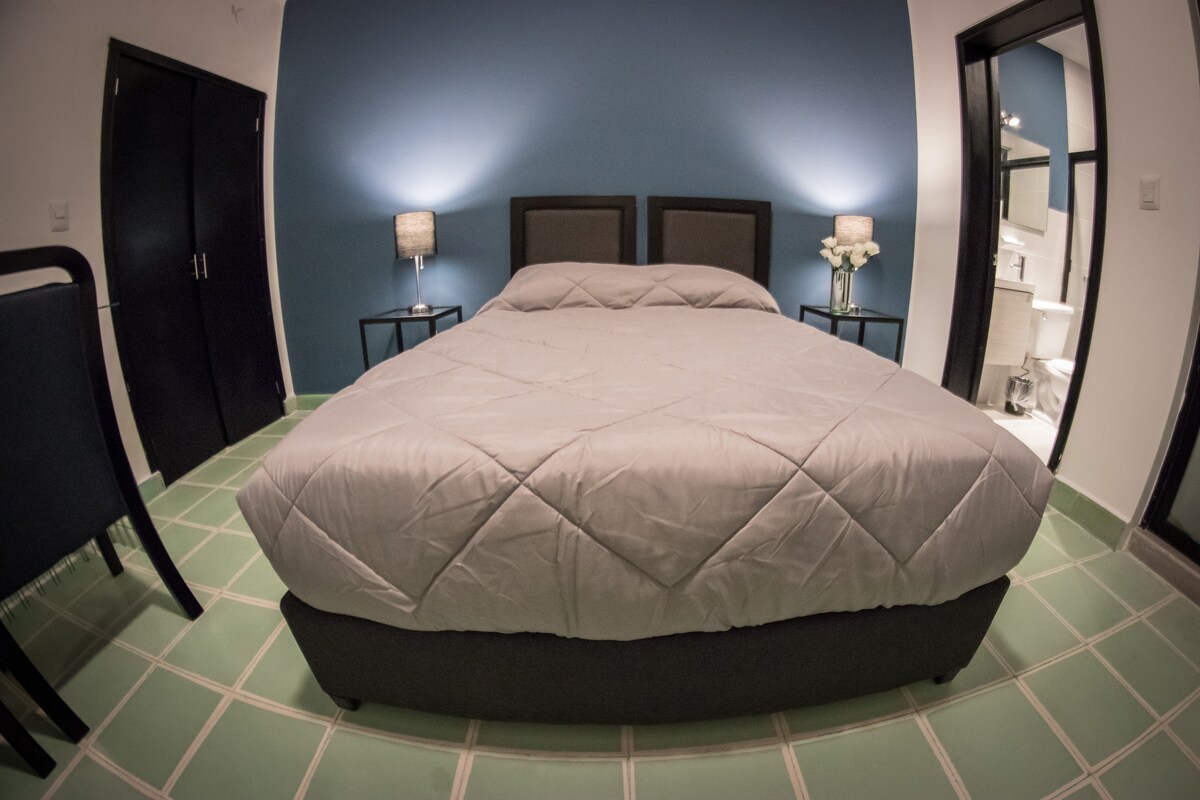 HABITACIÓN PRIVADA, CÓMODA Y BIEN EQUIPADA. Esta privada y acogedora habitación cuenta con cama matrimonial, baño privado completo, clóset amplio, ventilador y mesa de trabajo. Como beneficio exclusivo para nuestros huéspedes, al mostrar tu reservación de Casa Aldama, obtienes 10% de descuento en todas las cuentas el restaurante Bodegante, ubicado justo enfrente. Vive León como un local, con comodidad y ventajas únicas. ¡Reserva ahora y aprovecha este beneficio especial!