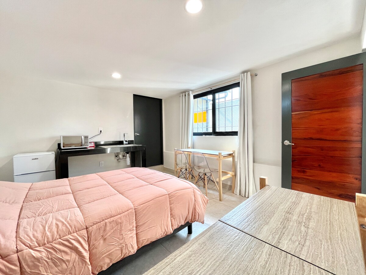 Departamento tipo loft totalmente equipado para gozar de una estadía realmente placentera y como en casa, diseño muy original y acogedor, una amplia terraza para tomar el sol y tener una rica tarde, ubicada cerca de cines, súper,farmacia y tienda de abarrotes frente al departamento, una zona tranquila de la ciudad, el lugar ideal para tener horas de descanso y/o trabajar sin el bullicio de estar en medio de la ciudad.