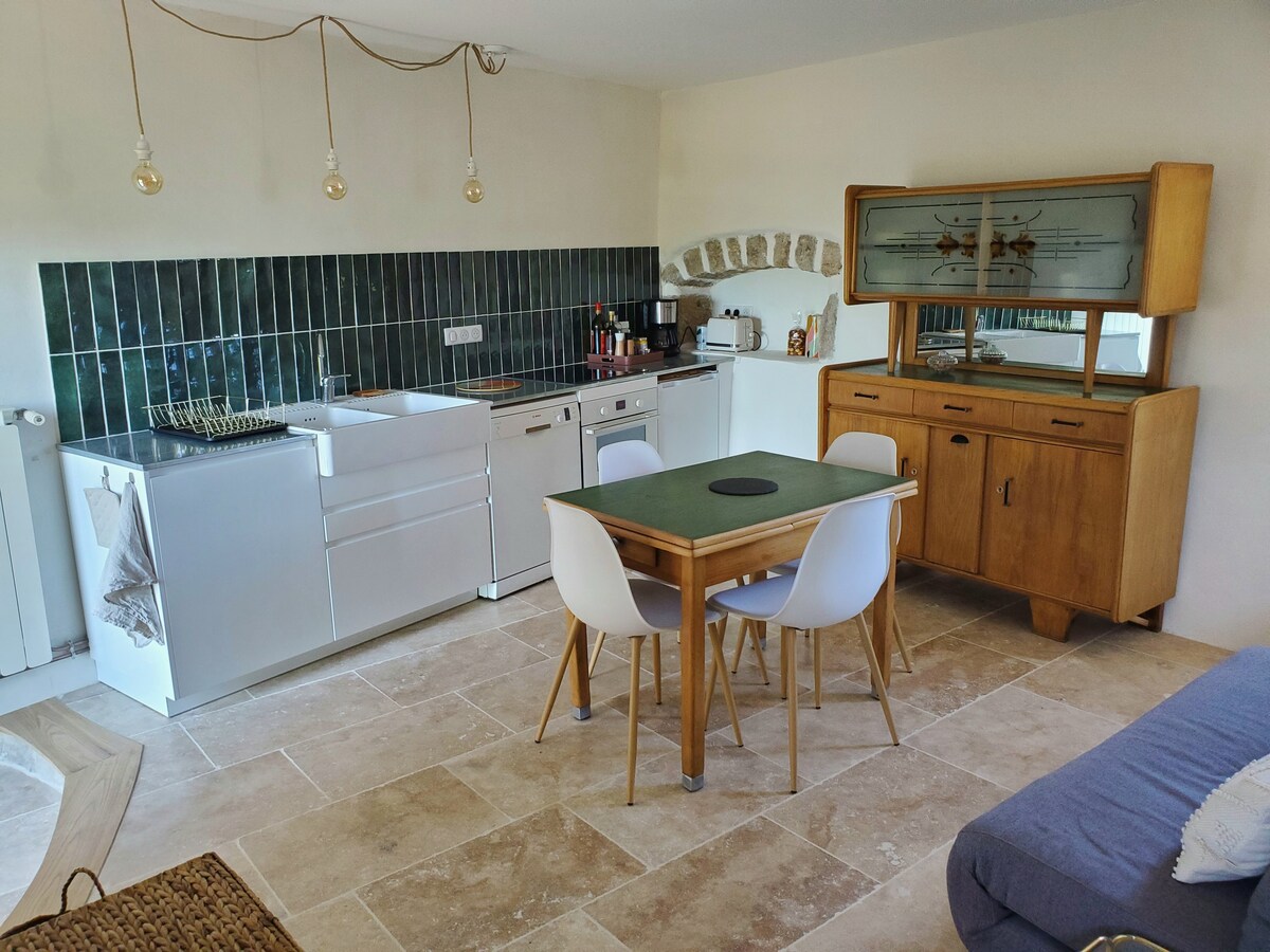 🏡 A Maison aux Massots meghív: 🌿 – légkondicionálás, kert és teljes nyugalom, egy szinten. Modern kényelem, autentikus báj és napfényes kert. Ideális 3 személy számára. MoMo szívélyesen fogad, és megosztja jó tippjeit a békés ardèche-i tartózkodáshoz 💛 🛏 2 hálószoba (160 cm-es ágy + 140 cm-es ágy) 🛋 Világos nappali – LED TV 🍳 Felszerelt konyha (sütő, mikrohullámú sütő, kávé stb.) 🚿 Fürdőszoba – olasz zuhanyzó 🌳 2000 m²-es, NEM KERÍTETT kert és saját parkoló 📶 Ingyenes Wi-Fi.
