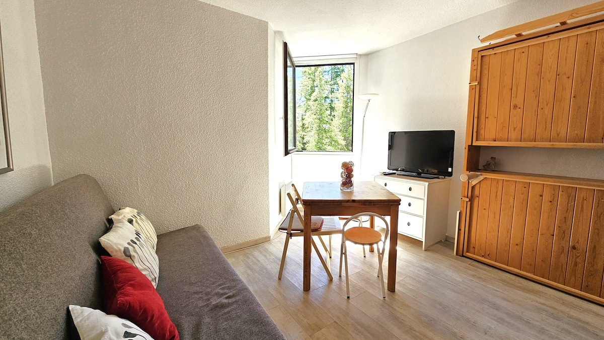 Bájos, 20 m2-es kis stúdió, amely a lejtők (50 méter) lábánál található, és üzletek ingyenes parkolással. A következőkből áll: - nappali TV-vel - egy kis terasz zöld környezetben felfüggesztve - egy zárt hegyi sarok emeletes ággyal és egy kis gardróbbal - tágas fürdőszoba zuhanykabinnal és WC-vel - egy kis hely a főzéshez, amely egy mosogatóból, egy mikrohullámú sütőből/sütőből, egy kis hűtőszekrényből és egy levehető elektromos főzőlapból áll.