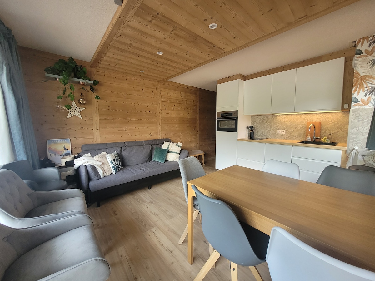 Apartman T2 a sípályák lábánál: nagyon világos és felújított 2021 nyarán: bejárat hegyi sarokkal, konyha mosogatógéppel, külön hálószoba, nappali/étkező, erkély (2 szék+ 1 dohányzóasztal +2 napozóágy) délkeleti fekvés, kivételes kilátással a hegyekre. Sítároló. 3 szánkó. Esernyőágy. Raclette-gép, kreppkészítő. Játékok. Ágyneműt és törülközőt nem tartalmaz. A lakást tisztítószerben kell visszaadni (porszívó és termékek a helyszínen).