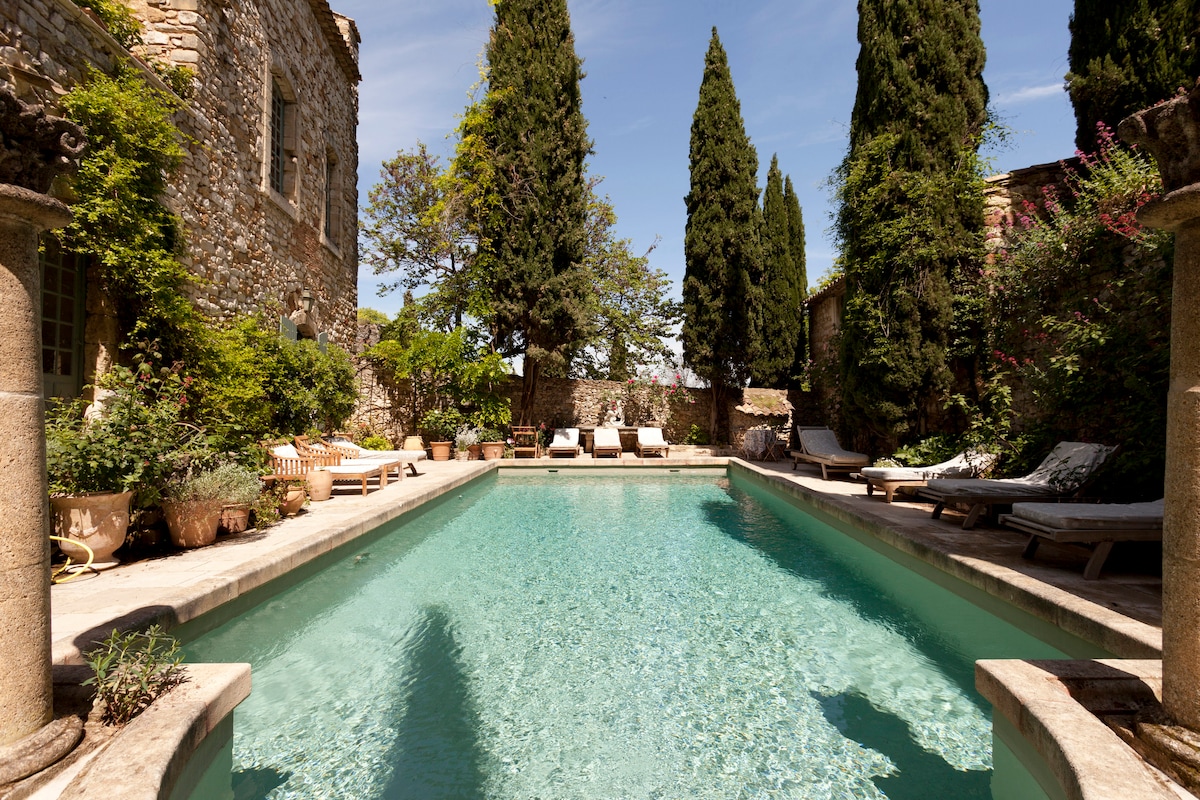 The cottage sits on the grounds of a castle dating back to 1543 offering an authentic stay. The interior retains a decor that matches the historic charm of the area with modern comforts added and a shared pool in the stunning gardens outside. This is our smallest cottage and cannot take an additional bed or cot. The other cottages are all larger and can do this. All 3 cottages can be rented separately or together. They are in the grounds of a 16th century castle with beautiful gardens and large swimming pool enclosed by stone walls. The lower salon and summer kitchen in the main chateau is available to share. Access is by the side garden gate and all cottages are accessed by stone steps- sadly not suitable for wheelchairs. We will most likely be present living in the main Chateau and available to help and advise about restaurants and things to do in the area. We will share the pool and gardens. The old village is in a beautiful part of France that is has retained its iconic beauty through the centuries and still feels untouched by modern life in many places. Experience true local dining and bakeries with scenic walking trails all around. parking is in the church square below the Chateau. There is a local taxi service in the village and bus service to Avignon, Banyols sur Ceze and Uzes but car hire is recommended. We are 20 minutes from Avignon TGV rail station and about an hour from Marseille, Nimes or Montpellier airports. The cottages are completely private and tranquil.