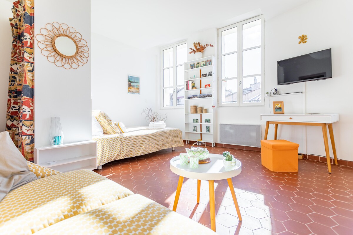 Grand studio lumineux au dernier étage avec ascenseur d'un immeuble haussmannien. Vue sur les toits du quartier du Panier. Il comprend : un lit pour 2 personnes, un canapé, une télévision (chaines internationales), un bureau, un coin cuisine avec plaques à induction, cafetières, bouilloire, grille-pain, micro ondes, lave linge, une salle d'eau avec une grande douche, dressing, ventilateurs, Wifi. Le ménage est fait dans le strict respect des règles sanitaires actuelles. Lit d'appoint+ 15€/nuit.