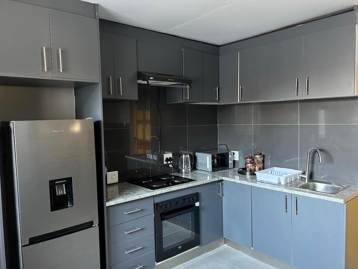 Élvezd a biztonságos és stílusos szállást ebben a modern, két hálószobás lakásban, közel az O.R. Tambo repülőtérhez. Élvezd a 24 órás helyszíni biztonsági őrök és a kényelmes 24 órás bejelentkezés, az ultragyors Wi-Fi, a légkondicionálás és a szünetmentes tápegységgel biztosított áramellátás előnyeit, amelyek megszakítás nélküli kapcsolatot és töltést biztosítanak az áramkimaradások során. Készítsd el az ételeket könnyedén a gáztűzhelyen, és élvezd a napenergiával fűtött zuhanyzó kényelmét. Tökéletes üzleti utazóknak és családoknak, akik kényelmet, biztonságot és nyugalmat keresnek.