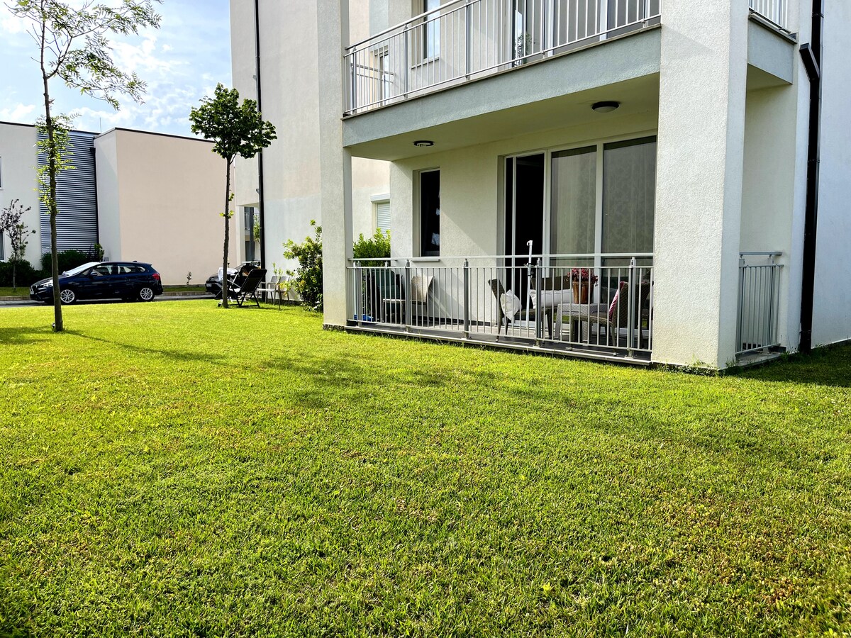 Strand, medence és kert, lakás