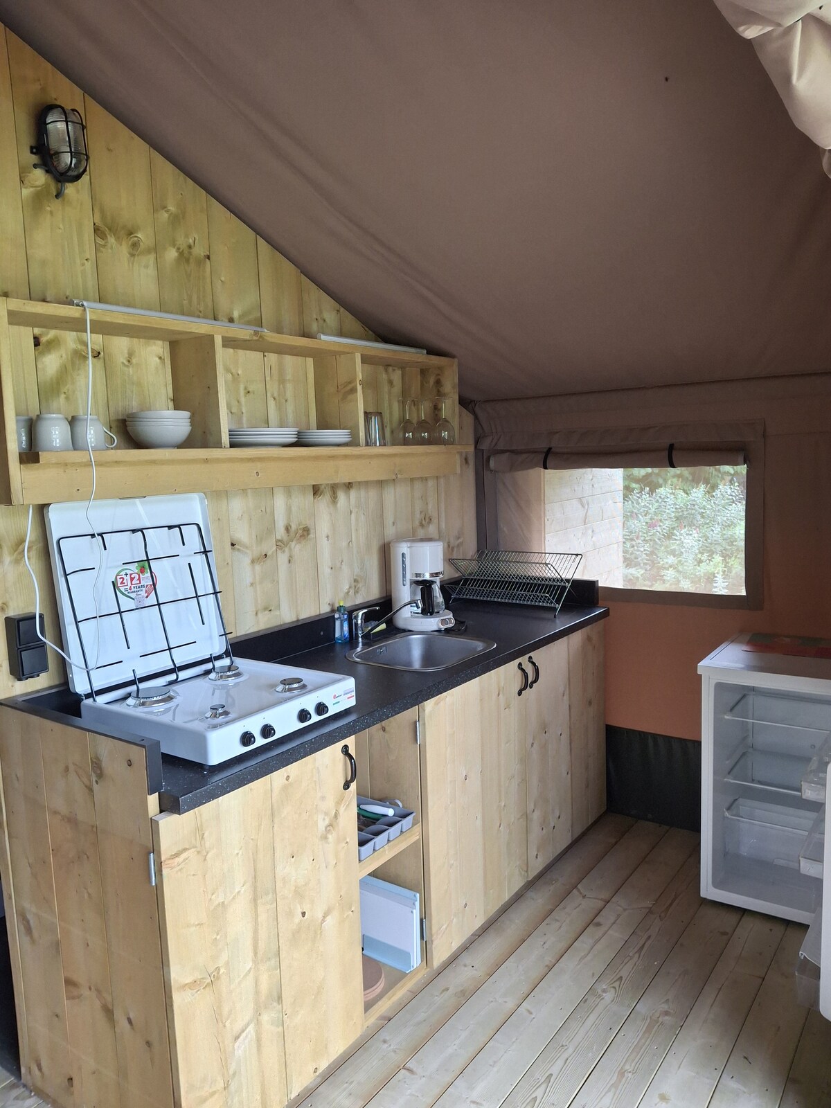 Ez az egyedi szafarisátor teljesen fel van szerelve a tökéletes glampingnyaraláshoz! A sátor hangulatos verandával és napellenzővel, teljesen felszerelt konyhával és két alvófülkével rendelkezik.