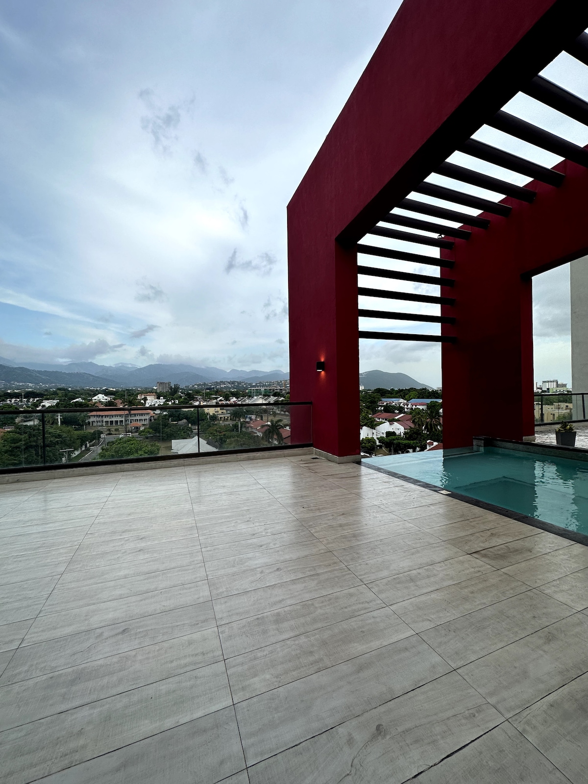 Modern 1 BD társasházi lakás tetőtéri medencével és fenséges kilátással