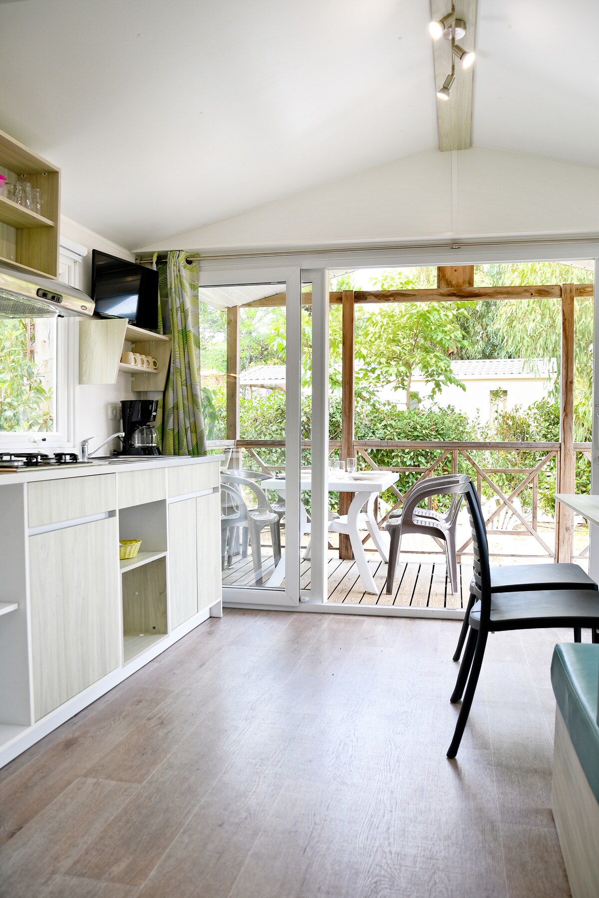 Ez a családi otthon közel van minden látnivalóhoz és kényelmi szolgáltatáshoz. 33 m² -es mobilház, gable terasszal, ideális 4 fő részére, négy szobából áll: Étkező felszerelt konyhával, zuhanyzóval és két hálószobával a szomszédban. (Egy hálószoba franciaággyal és egy második két egyszemélyes ággyal) Kint egy fedett fapadló és kerti bútorok.