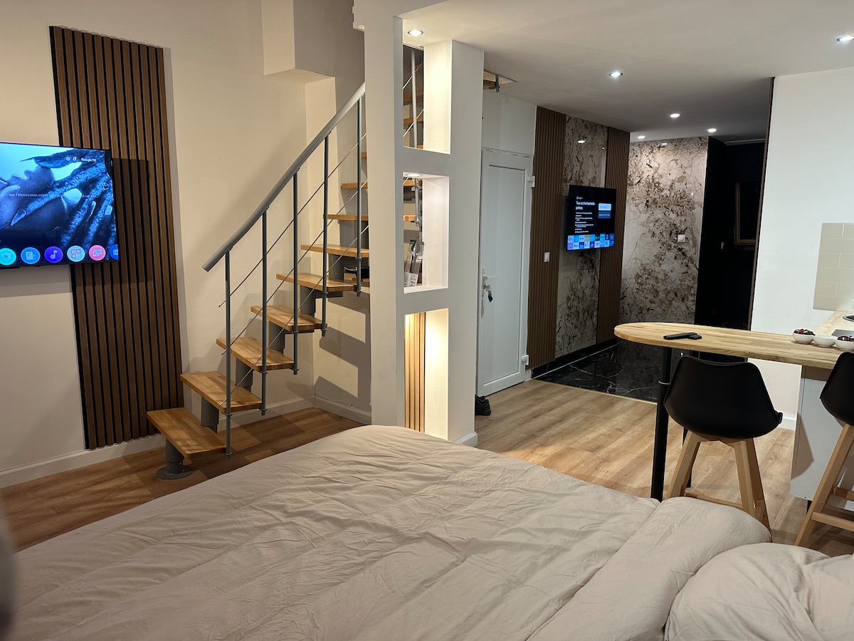 Découvrez le confort ultime dans notre appartement de 80m2, situé entre le Louvre Lens et le stade de Lens. Profitez d'un jacuzzi 2 places avec 95 jets, d'une TV OLED 4K de 165cm. La cuisine équipée. La salle de bain offre une douche italienne, des toilettes suspendues, un miroir LED anti-buée et un sèche-serviette. La chambre dispose d'un grand lit 180x200cm un filet suspendu de 10m2 avec une toile 260cm d'un canapé, d'une table basse, et d'une machine Nespresso un vidéoprojecteur UHD 4K HDR