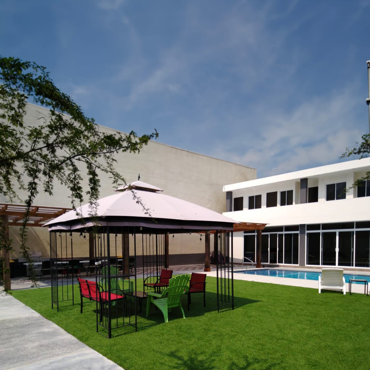 ¡Relájate en este espacio tan tranquilo y elegante.! 22 horas de renta Acceso a toda la casa Palapa Mesas Sillas Asador Alberca con chapoteadero e iluminación Aceptamos grupo en vivo WIFI TV con excelente audio Hielera Refrigerador Disco para discada (solo disco) Parrilla tipo Estufa (2 mecheros) 4 Habitaciones climatizadas (Frio/Calor) Estancia climatizada (frio/calor) 2 Baños completos -Puedes añadir con costo extra: Decoración con temática especial Calentadores para exterior