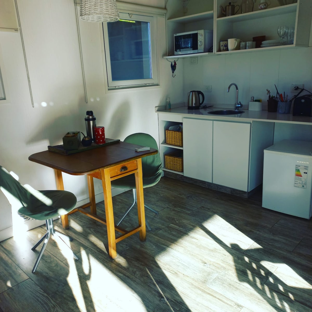 Vivienda restaurada en zona centrica de la ciudad. Equipada para que puedas hacer todo lo que necesites desde cocinar, lavar y relajarte. Cuenta con con heladera + freezer, horno, microondas, anafe vitroceramico + extractor, lavaropas. Cocina completa con utensillos, platos, vasos, ollas y pava eléctrica. Calefactores TB + sensores de humo y monoxido. Aire Acondicionado y ventilador.