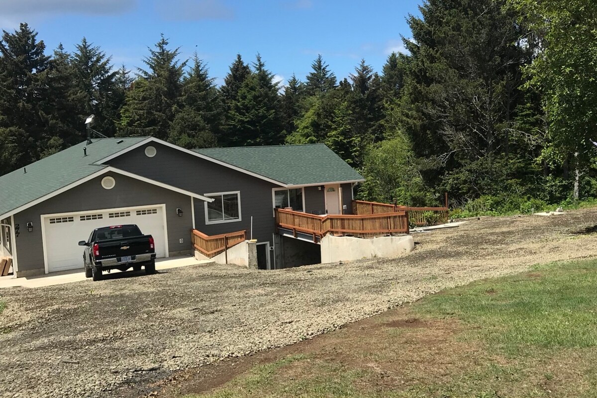Beautiful home located in a very relaxing and secluded residential area. Very Private setting with one bedroom which has a queen bed with sofa sleeper and its own private full bath. Living room area has a kitchenette at the lower level (no induction stove) and a lovely lounge area. stairs to access the lower level. This new home is nestled in the woods and you can hear the waves crashing. The home is 8 min walking distance to the Pacific ocean beach and Lost Creek State park.